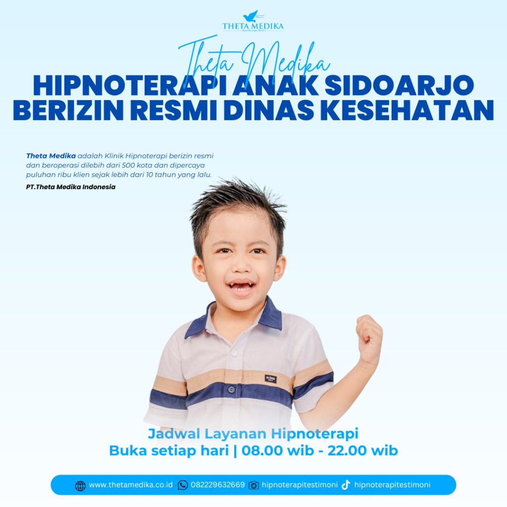 Hipnoterapi Anak Sidoarjo Berizin Resmi Dinas Kesehatan – Hipnoterapi anak di Sidoarjo kini menjadi solusi alternatif yang semakin diminati oleh para orang tua yang peduli terhadap kesehatan mental dan perilaku anak. Metode terapi ini terbukti efektif dalam membantu anak mengatasi berbagai masalah, seperti kecemasan, susah tidur, tantrum, mengompol, hingga gangguan belajar—tanpa obat-obatan dan dengan pendekatan yang menyenangkan. Di tengah meningkatnya kebutuhan akan terapi anak yang aman dan profesional, kini telah hadir layanan hipnoterapi anak di Sidoarjo yang berizin resmi dari Dinas Kesehatan Kabupaten Sidoarjo, memberikan rasa aman dan kepercayaan bagi masyarakat. Dengan adanya legalitas resmi ini, layanan hipnoterapi tidak hanya diakui secara hukum, tetapi juga telah melalui proses verifikasi fasilitas, kompetensi terapis, dan kelayakan ruang praktik. Bagi orang tua yang sedang mencari tempat hipnoterapi anak terpercaya di Sidoarjo. Hipnoterapi Anak Sidoarjo Berizin Resmi Dinas Kesehatan – Salah satu klinik yang sering direkomendasikan untuk hipnoterapi anak di Sidoarjo adalah Theta Medika Sidoarjo. Klinik ini memiliki tim hipnoterapis bersertifikat yang berpengalaman menangani berbagai kasus pada anak, mulai dari ketakutan makan nasi, kecanduan gadget, hingga gangguan emosi. Dengan pendekatan yang lembut dan personal, Theta Medika Sidoarjo menjadi pilihan tepat bagi orang tua yang ingin membantu anak tumbuh lebih sehat secara mental dan emosional.