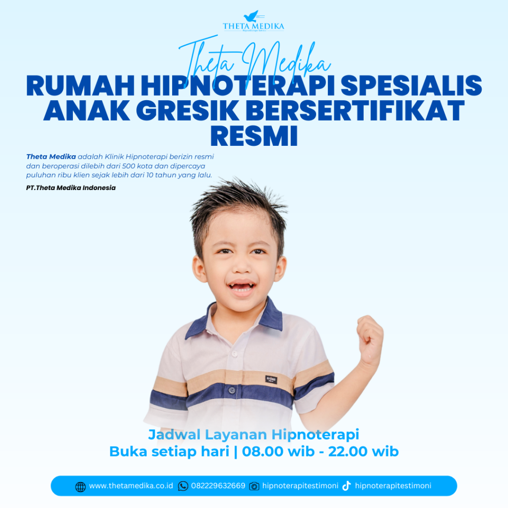 - Hipnoterapi merupakan solusi yang efektif dan aman untuk membantu anak mengatasi berbagai permasalahan psikologis dan perilaku. Theta Medika Hipnoterapi Gresik siap menjadi mitra bagi orang tua dalam membantu anak mereka berkembang dengan lebih baik. Jika Anda memiliki anak yang menghadapi masalah seperti kecemasan, kurang percaya diri, atau kebiasaan buruk, segera konsultasikan ke Theta Medika untuk mendapatkan solusi terbaik.