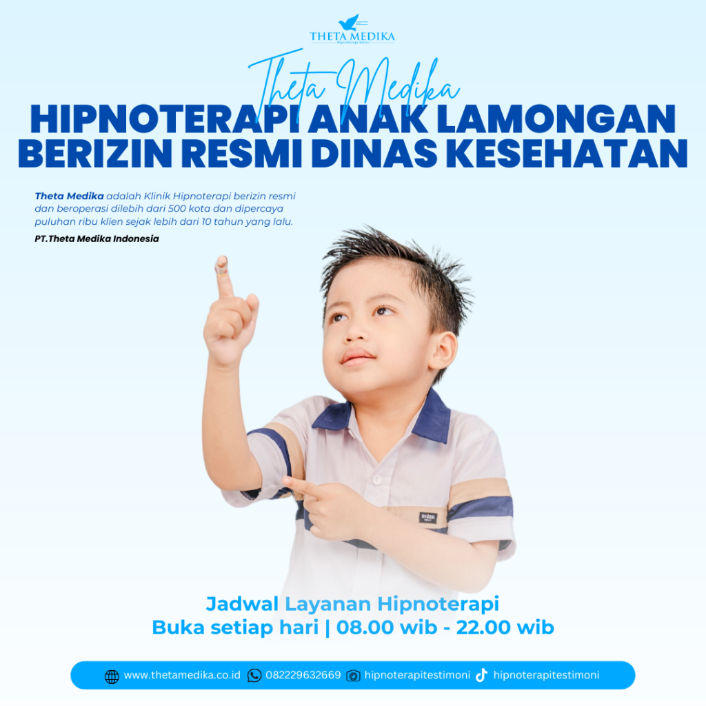 - Hipnoterapi merupakan solusi yang efektif dan aman untuk membantu anak mengatasi berbagai permasalahan psikologis dan perilaku. Theta Medika Hipnoterapi Lamongan siap menjadi mitra bagi orang tua dalam membantu anak mereka berkembang dengan lebih baik. Jika Anda memiliki anak yang menghadapi masalah seperti kecemasan, kurang percaya diri, atau kebiasaan buruk, segera konsultasikan ke Theta Medika untuk mendapatkan solusi terbaik.