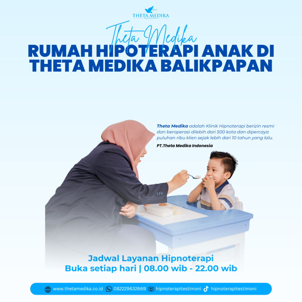 Rumah Hipoterapi Anak Di Theta Medika Balikpapan – Jika Anda sedang mencari layanan hipnoterapi anak di Balikpapan yang terpercaya dan berpengalaman, maka Rumah Hipnoterapi Anak di Theta Medika Balikpapan adalah pilihan yang tepat. Berlokasi strategis di jantung kota Balikpapan, pusat terapi ini telah membantu ribuan anak dalam mengatasi berbagai permasalahan seperti susah makan, fobia, kecemasan, sulit konsentrasi, hingga gangguan perilaku. Theta Medika merupakan klinik hipnoterapi bersertifikat nasional yang sudah dikenal luas di Indonesia, termasuk di Kalimantan Timur. Dengan menggunakan metode hipnoterapi anak yang aman, menyenangkan, dan berbasis pendekatan psikologi perkembangan, Rumah Hipnoterapi Anak Balikpapan ini menggabungkan teknik hipnosis modern, stimulasi oromotorik, modifikasi perilaku, dan pelatihan parenting untuk memberikan hasil terapi yang efektif dan menyeluruh. Didukung oleh tim profesional berpengalaman, Theta Medika Cabang Balikpapan menjadi tempat terbaik bagi orang tua yang ingin memberikan dukungan emosional dan mental terbaik bagi tumbuh kembang anak mereka.