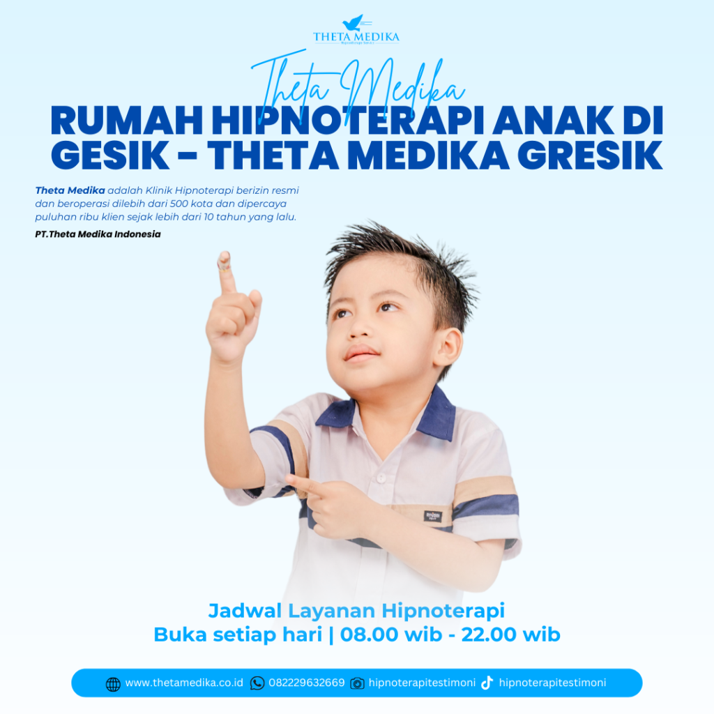 - Hipnoterapi merupakan solusi yang efektif dan aman untuk membantu anak mengatasi berbagai permasalahan psikologis dan perilaku. Theta Medika Hipnoterapi Gresik siap menjadi mitra bagi orang tua dalam membantu anak mereka berkembang dengan lebih baik. Jika Anda memiliki anak yang menghadapi masalah seperti kecemasan, kurang percaya diri, atau kebiasaan buruk, segera konsultasikan ke Theta Medika untuk mendapatkan solusi terbaik.