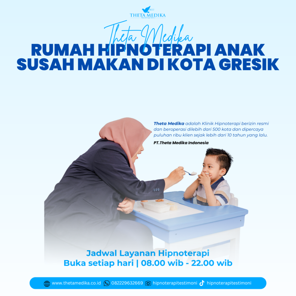 Theta Medika adalah klinik hipnoterapi profesional bersertifikat resmi dan berizin Dinas Kesehatan. Kami telah membantu ribuan anak di Gresik, dan sekitarnya untuk terbebas dari masalah makan.