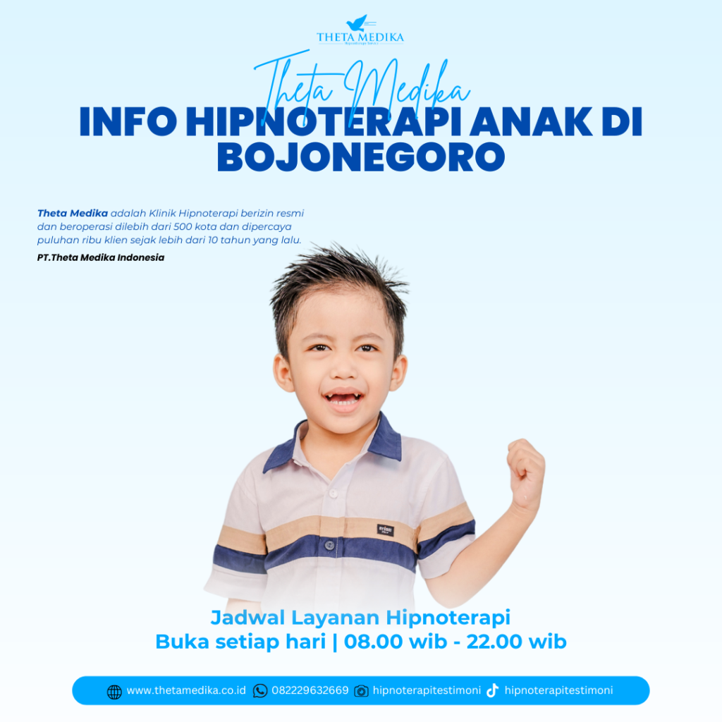 - Hipnoterapi merupakan solusi yang efektif dan aman untuk membantu anak mengatasi berbagai permasalahan psikologis dan perilaku. Theta Medika Hipnoterapi Bojonegoro siap menjadi mitra bagi orang tua dalam membantu anak mereka berkembang dengan lebih baik. Jika Anda memiliki anak yang menghadapi masalah seperti kecemasan, kurang percaya diri, atau kebiasaan buruk, segera konsultasikan ke Theta Medika untuk mendapatkan solusi terbaik.